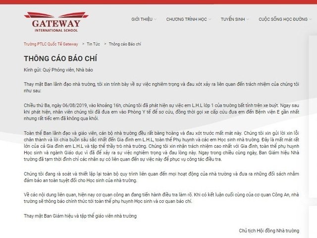 Trường Quốc tế Gateway cho biết đã tạm thời đình chỉ các nhân sự có liên quan đến sự việc này để phục vụ công tác điều tra và đang cho rà soát, thiết lập lại toàn bộ quy trình liên quan đến mọi hoạt động của trường.