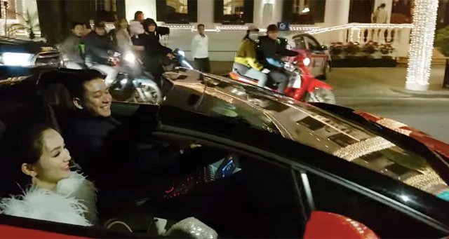 Nam ca sĩ lái chiếc siêu xe Lamborghini giá 25 tỉ, cùng vợ xuống đường “đi bão” và dẫn đầu đoàn người đi ăn mừng tại Hà Nội tối qua.