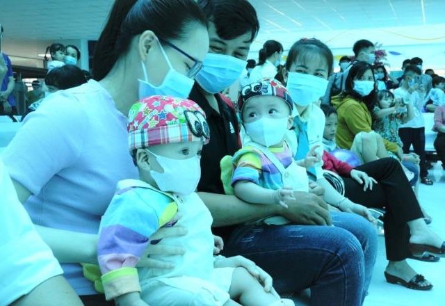Hai chị em Trúc Nhi, Diệu Nhi được ba mẹ bế đi chơi Trung thu cùng hàng trăm bệnh nhi khác tại Bệnh viện Nhi đồng TP.HCM.