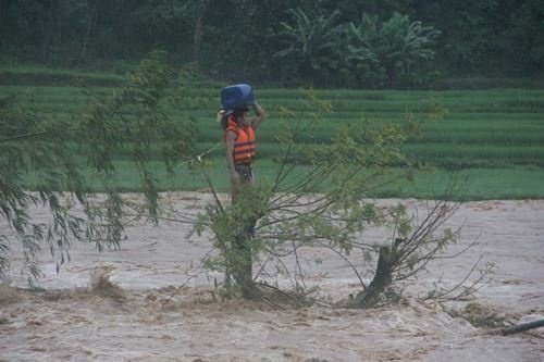Thầy giáo khiêng xe máy băng qua nước lũ đến trường
