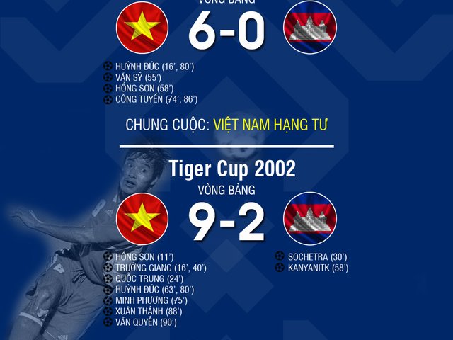 Việt Nam toàn thắng khi đối đầu Campuchia tại Tiger Cup, AFF Cup và ghi trung bình 5,8 bàn mỗi trận.