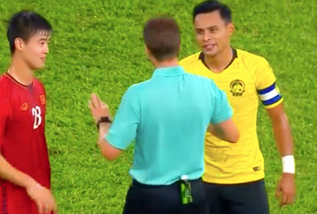 Hậu vệ Việt Nam có một pha đánh nguội với đội trưởng Zaquan Adha ở phút 11 nhưng trọng tài không quan sát kịp.