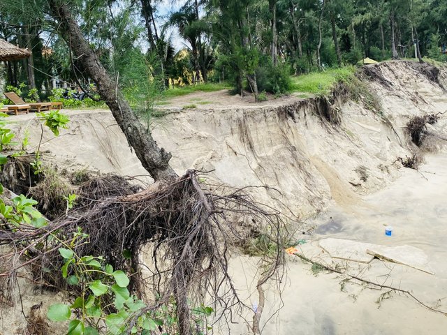 Sau khi phá đứt gãy đoạn đường bêtông dẫn ra biển, quật ngã hàng phi lao, sóng lớn tiếp tục "ngoạm" sâu vào bờ và uy hiếp khu villa, nhà hàng,... ven biển Hội An.