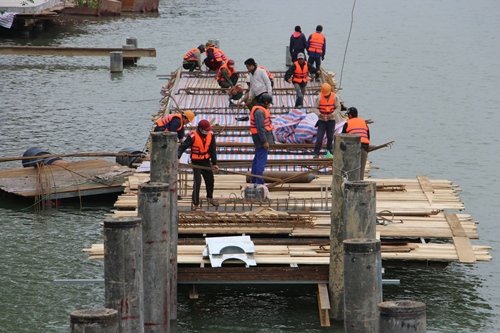 Cọc bê tông được đóng xuống sông Hương để thi công tuyến đường đi bộ dài 380 m.