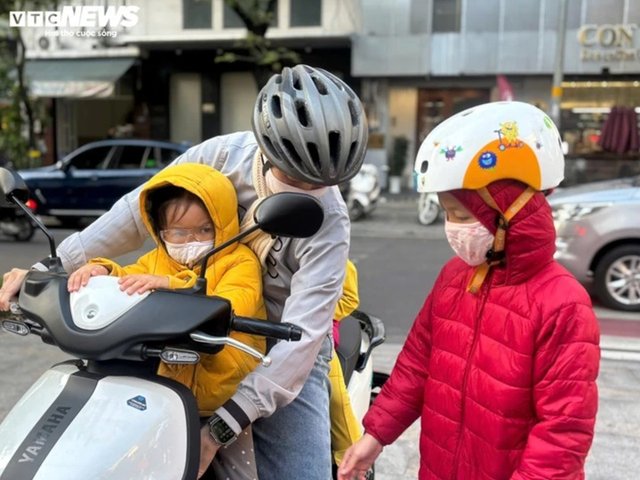 Không khí lạnh tràn về, Hà Nội chuyển rét rõ rệt trong sáng 2/1, nhiều người ra đường sớm phải khoác áo mưa, mặc thêm áo ấm để chống gió lạnh.