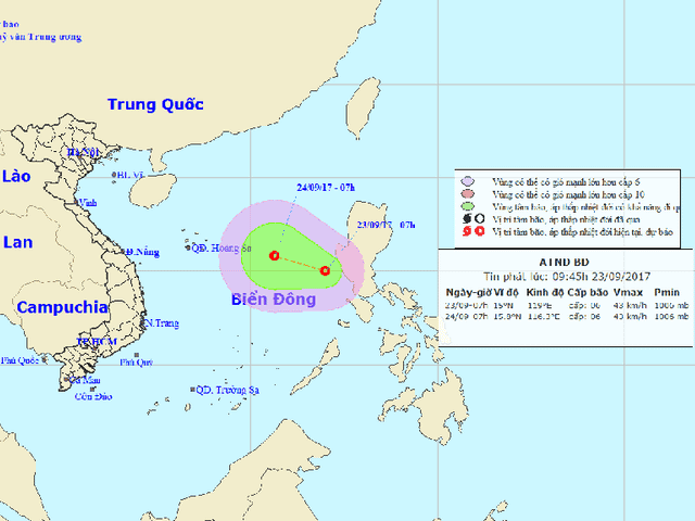 Áp thấp nhiệt đới hình thành sáng nay (23.9) sẽ gây mưa giông, gió giật mạnh ở khu vực giữa và nam Biển Đông.