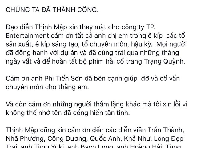 Ngày mùng 7 Tết, đạo diễn Đức Thịnh tuyên bố "Trạng Quỳnh" đã đạt doanh thu 70 tỷ đồng và cảm ơn đích danh Trấn Thành, đồng thời anh cũng tự nhận mọi lỗi về mình.