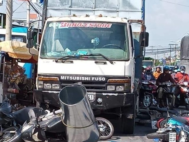 Hàng loạt xe máy đang dừng chờ đèn đỏ thì bị xe tải lao tới tông văng nằm la liệt, 11 người bị thương phải nhập viện cấp cứu.