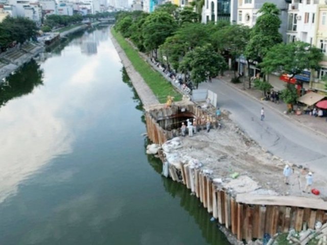 Sụt lún đường bờ sông Tô Lịch có thể do đất nền yếu và mưa lớn