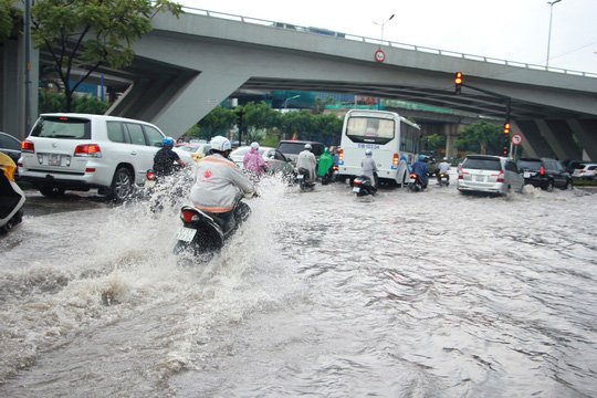 Cơn mưa chiều tối nay (6/8) kéo dài hơn 2 tiếng ở TP.HCM khiến một số đường ngập sâu, nhiều ô tô chết máy xếp hàng trong dòng nước.