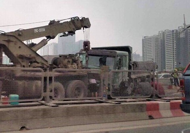 Xe tải đi trên đường vành đai 3 tự đâm vào dải phân cách rồi lật nghiêng, chắn ngang đường gây ùn tắc kéo dài ở Hà Nội.