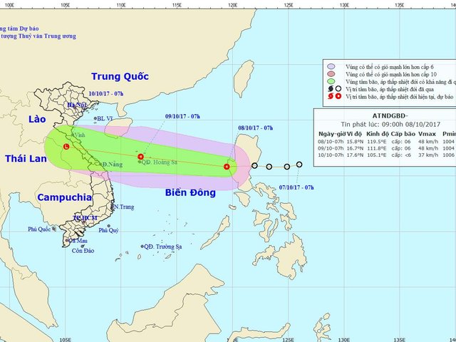 Tin mới nhất về áp thấp nhiệt đới trên Biển Đông Hồi 7 giờ sáng nay 8.10, vị trí tâm áp thấp nhiệt đới ở vào khoảng 15,8 độ Vĩ Bắc; 119,5 độ Kinh Đông, cách quần đảo Hoàng Sa khoảng 800km về phía Đông Đông Nam. Sức gió mạnh nhất ở vùng gần tâm áp thấp nhiệt đới mạnh cấp 6 40-50kmgiờ, giật cấp 8.