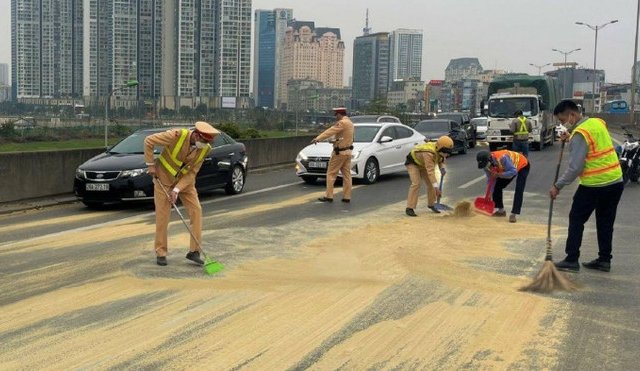 Thông tin từ Đội CSGT số 6, Phòng CSGT, Công an TP Hà Nội cho biết, chiều 21/2, cán bộ, chiến sĩ Đội CSGT số 6 đã giúp lái xe thu dọn nhiều bao tải cám rơi trên đường Vành đai 3 trên cao.