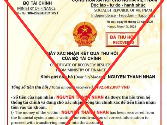 Bộ Tài chính khuyến cáo người dân, doanh nghiệp cần cảnh giác trước việc giả mạo, lợi dụng danh nghĩa của Bộ Tài chính để lừa đảo người dân nhằm trục lợi cá nhân. Đề nghị người dân, doanh nghiệp nâng cao cảnh giác, thận trọng trong các giao dịch chuyển tiền đối với những người không quen biết trên không gian mạng.