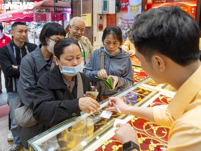 Ngày 8/4, rất đông khách kéo đến các cửa hàng vàng ở Hà Nội chờ giao dịch vàng nhẫn, những ai muốn mua số lượng lớn phải sau 1 - 2 tuần mới được nhận hàng.