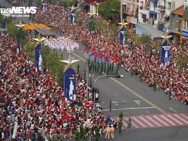 Trong Lễ kỷ niệm 30/4, nhìn từ trên cao, các khối diễu binh giữa những bước chân đều đặn, cờ hoa rực rỡ, trong sự chào đón của người dân hai bên đường.