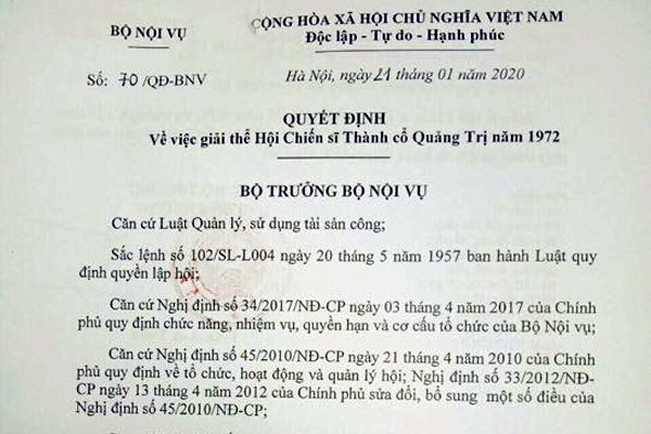 Bộ Nội vụ vừa có quyết định giải thể Hội chiến sĩ thành cổ Quảng Trị năm 1972, liên quan đến những sai phạm xảy ra tại Hội này.