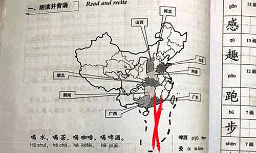 Bản đồ có "đường lưỡi bò" được in trong trang 36 cuốn Đọc sơ cấp 1 "Developing Chinese" của Đại học Kinh doanh và Công nghệ Hà Nội.