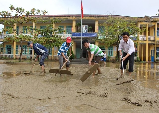 Giáo viên dọn dẹp sau lũ đón học sinh trở lại trường