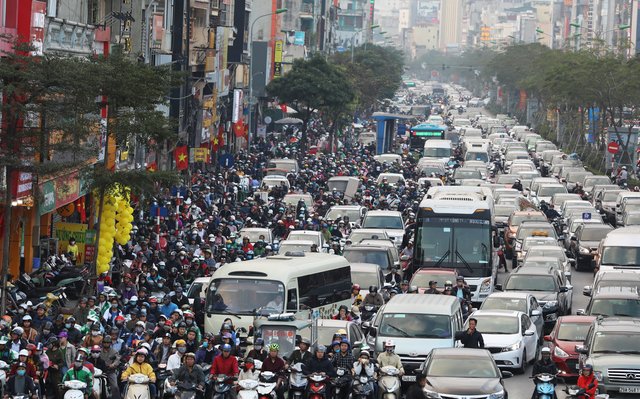 Chiều 27 tháng Chạp, dòng phương tiện nhích từng cm trên nhiều tuyến phố thủ đô.
