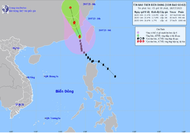 Sức gió mạnh nhất vùng gần tâm bão số 2 (bão Doksuri) mạnh cấp 13-14, giật cấp 16, cách Phúc Kiến (Trung Quốc) khoảng 120 km, suy yếu dần trong hôm nay.