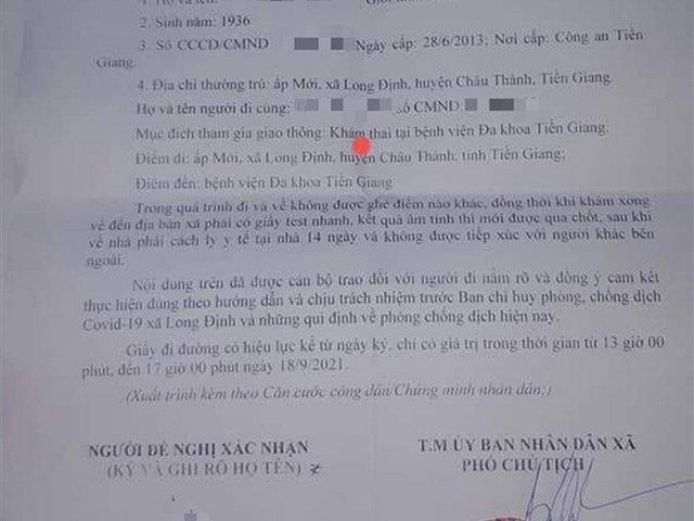 Cán bộ UBND xã Long Định, huyện Châu Thành (Tiền Giang) cấp giấy đi đường cho cụ ông 85 tuổi, ghi mục đích ra đường để "khám thai tại Bệnh viện Đa khoa".