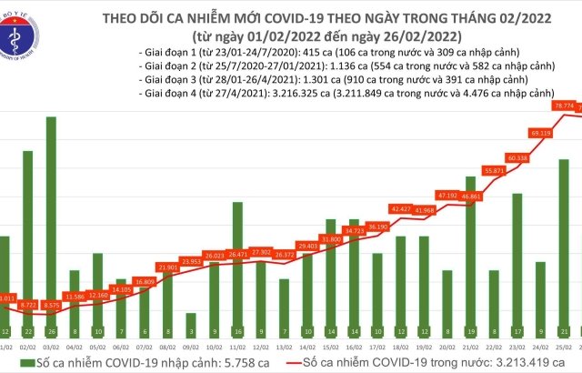 Chiều 26/2, Bộ Y tế công bố thêm 77.982 người mắc COVID-19, Hà Nội đứng đầu cả nước với 10.783 ca.