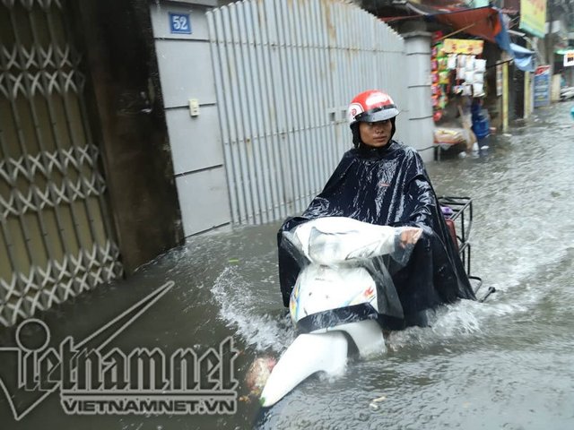 Hà Nội mưa cực to, xe máy chìm nghỉm trong biển nước