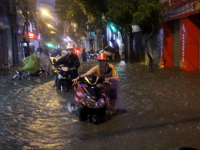 Cơn mưa chiều tối nay khiến nhiều tuyến phố Hà Nội bị ngập nặng. Nước ngập mênh mông kéo theo rác nổi lềnh bềnh khiến người đi đường chao đảo về nhà.