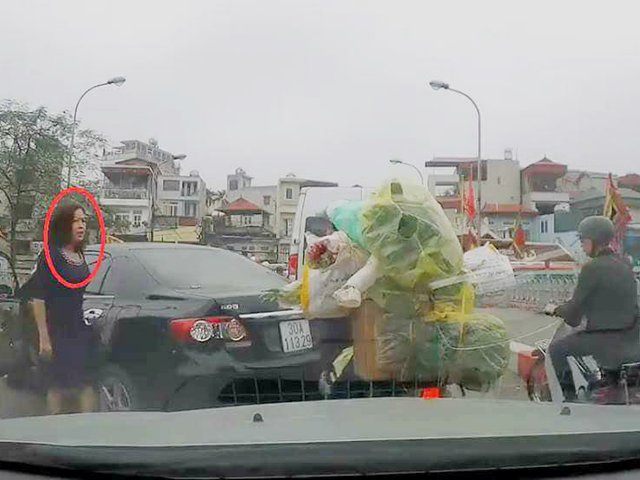 Vì lùi đột ngột nên chiếc Toyota đụng phải xe máy phía sau, trên đường Hà Nội đang kẹt xe.