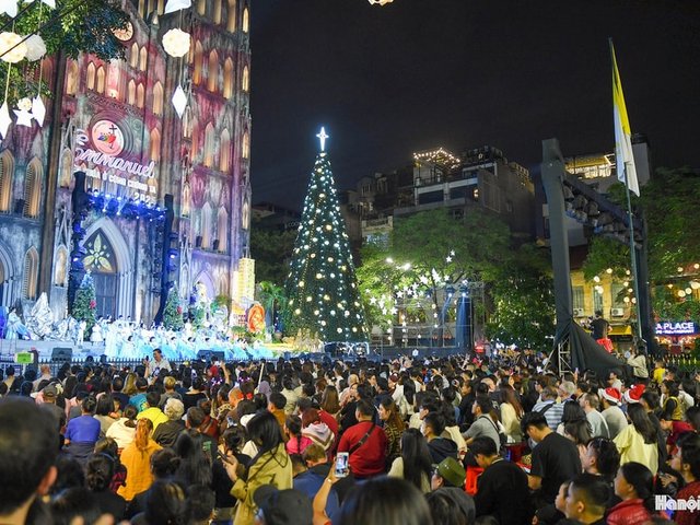 Tối 24-12, rất đông người dân đổ về Nhà thờ Lớn, Nhà thờ Hàm Long và những tuyến phố trung tâm Hà Nội để vui chơi, đón Giáng sinh 2025.