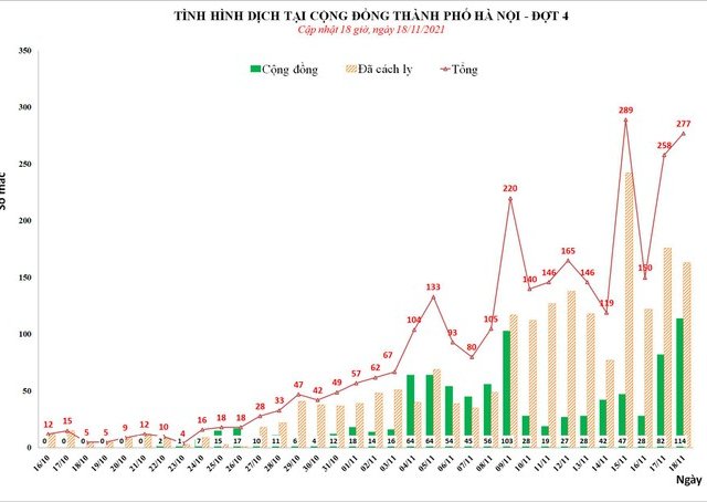 Chiều tối 18-11, Sở Y tế Hà Nội công bố ghi nhận 277 ca Covid-19 mới, trong đó có tới 114 ca cộng đồng phân bố tại 22 quận huyện, cùng đó cũng bùng thêm 1 ổ dịch mới...