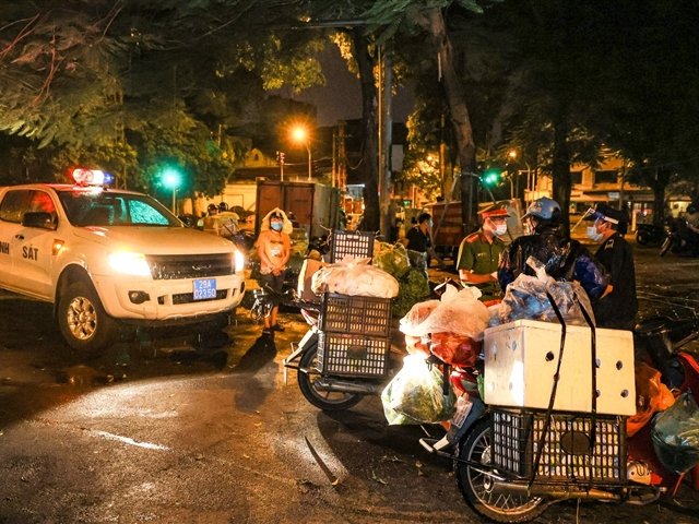 Đêm 16 rạng sáng 17/8, lực lượng chức năng phường Quán Thánh (Hà Nội) ra quân xử lý các trường hợp vi phạm quy định phòng dịch, dẹp bỏ chợ tự phát cạnh Bốt Hàng Đậu.