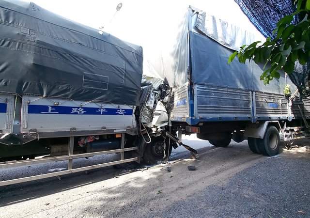 Xe tải tông nhau trên quốc lộ 1A, hai người bị thương, một cụ bà thoát chết trong gang tấc