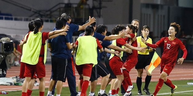 Hải Yến đánh đầu tung lưới Thái Lan trong phút thi đấu đầu tiên của hiệp phụ thứ nhất trận chung kết bóng đá nữ SEA Games 30.