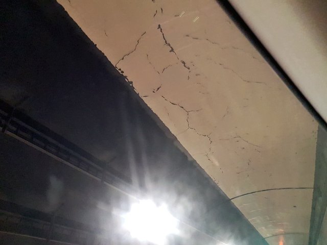 Cách cửa phía Nam của hầm đường bộ Hải Vân chừng 200m đang có hàng loạt vết nứt trải dài. Nhiều vết nứt đan xen nhau, chằng chịt trên thành hầm.