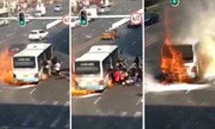 Một chiếc xe buýt bốc cháy trên phố ở thành phố Cáp Nhĩ Tân, Trung Quốc khiến hành khách giẫm đạp lên nhau tháo chạy.