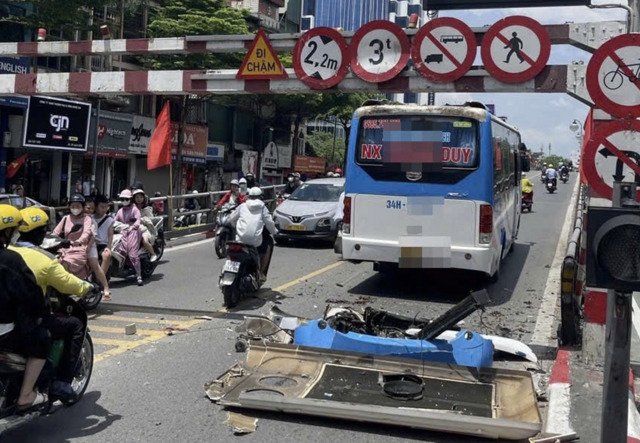 Phạt tài xế lái xe khách lên cầu vượt Thái Hà, làm hư hỏng biển báo