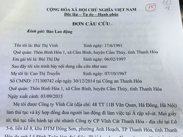 Do bà Cao Thị Truyền (sinh năm 1967) đã hết hạn hợp đồng gần 5 tháng nhưng không được nhà chủ bên Saudi Arabia làm thủ tục để về Việt Nam, đồng thời còn bị chủ nợ hơn 7 tháng lương nên 2 người con gái của bà đã gửi đơn cầu cứu đến Báo Lao Động để nhờ lên tiếng, giúp bà Truyền sớm sum họp với gia đình.