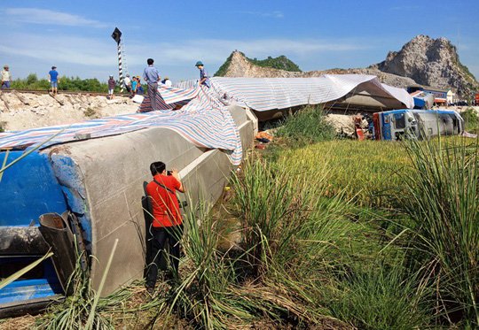 Do vụ tai nạn đường sắt đặc biệt nghiêm trọng nên đến khoảng 9 giờ 30 phút sáng nay 24-5, công tác khắc phục vẫn chưa hoàn thành, các toa tàu vẫn còn nằm ngổn ngang dưới ruộng, công an vẫn đang khám nghiệm tại hiện trường ngổn ngang đầu tàu, các toa tàu và xe tải lật.