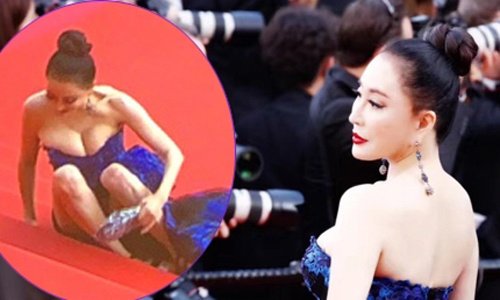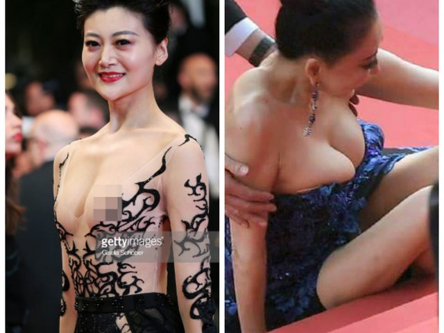 Hình Tiểu Hồng- Hoa hậu Quý bà Trung Quốc vờ ngã trên thảm đỏ để khoe vòng 1 như muốn bật tung ra khỏi váy, còn Triệu Hân- Hoa hậu Du lịch Trung Quốc thì táo bạo hơn, lộ hẳn nhũ hoa trước hàng ngàn ống kính máy ảnh tại Cannes.
