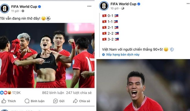 "Tôi vẫn đang nín thở đây!", "Việt Nam chiến thắng nhờ bàn thắng phút 90+5"..., trang FIFA World Cup đăng liền 2 dòng trạng thái theo diễn biến trận Việt Nam - Philippines tối 6-6.