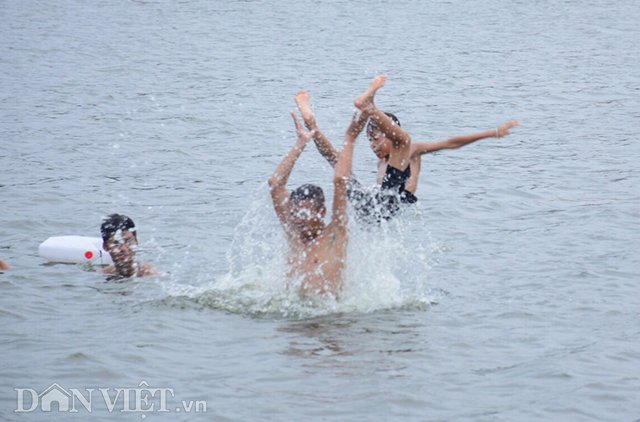 Ảnh: Ngó lơ biển cấm, người dân tự ý xuống tắm tại hồ Linh Đàm