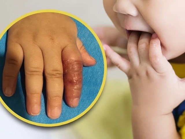 Ngón trỏ của em bé 11 tháng tuổi bắt đầu bị hoại tử, suýt phải cắt cụt do bị mẹ dùng băng quấn chặt; chị làm như vậy để ngăn con mút tay.