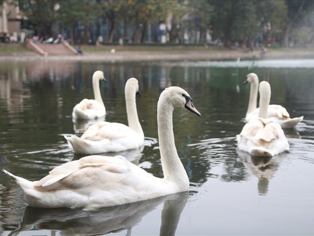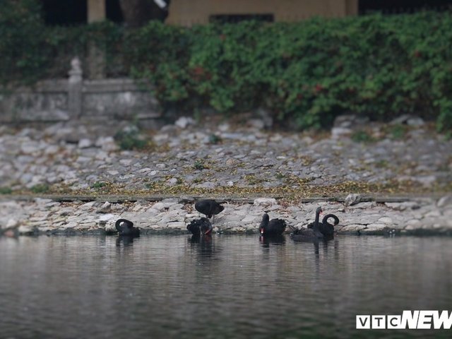 Được di chuyển tới hồ Thiền Quang (Hà Nội) từ trước tết Nguyên đán, đàn thiên nga gồm 12 con vẫn đầy đủ số lượng, chia tách thành từng nhóm bơi quanh hồ.