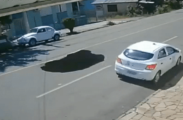 Chiếc hố xuất hiện khi xe tải chở đất chạy qua và ôtô con lao thẳng tới.
