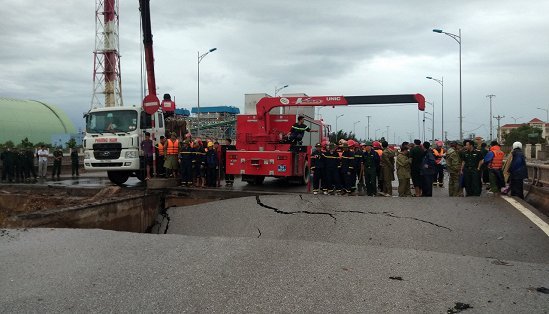 Mặt cầu Yên Hòa huyện Tĩnh Gia, tỉnh Thanh Hóa bỗng nhiên sụt lún khiến 5 người đi xe máy mắc kẹt, đất đá vùi lấp 2 người.