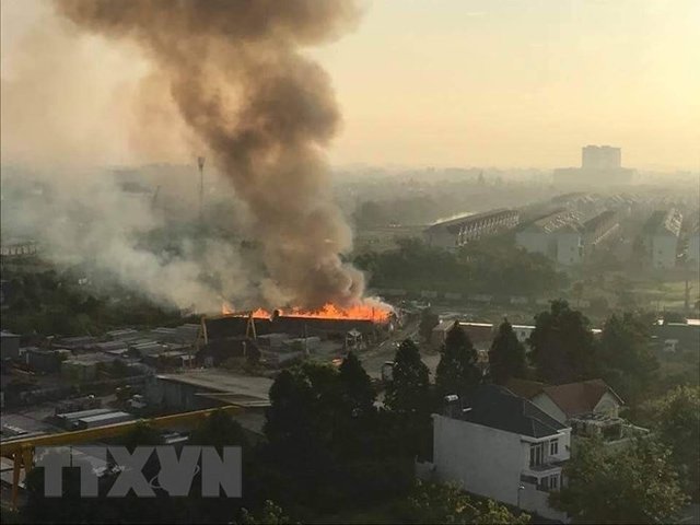 Ngọn lửa bùng phát dữ dội từ trong kho của công ty sản xuất gỗ, khiến nhiều người hoảng sợ bỏ chạy khi phát hiện vụ hỏa hoạn.