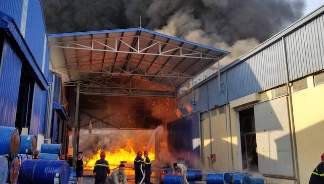 Nhiều tiếng nổ lớn liên tục vang lên bên trong nhà xưởng bốc cháy ngùn ngụt khiến cảnh sát không thể đưa vòi nước tiếp cận hiện trường.