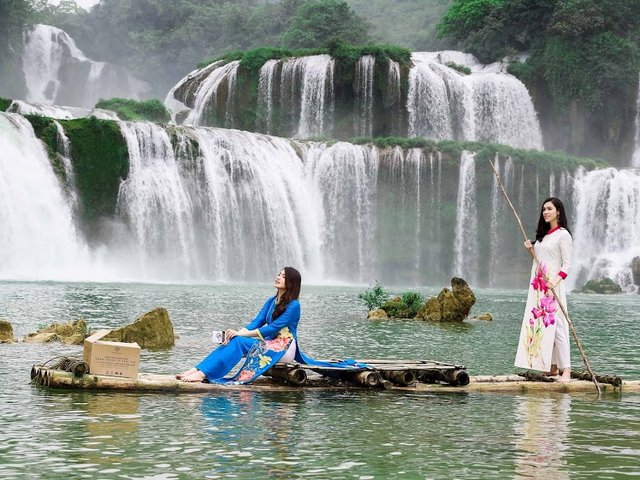 Á hậu Lệ Hằng, Hoàng My, Trương Thị May diện áo dài, khoe nhan sắc bên thác Bản Giốc